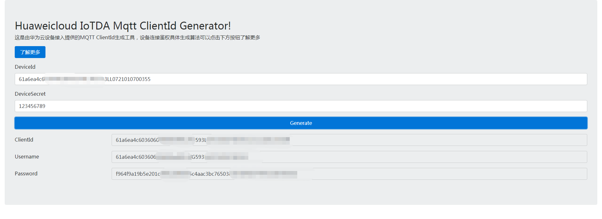 通過(guò)以下鏈接生成連接所需的用戶名、密碼和ClientID:https://iot-tool.obs-website.cn-north-4.myhuaweicloud.com/