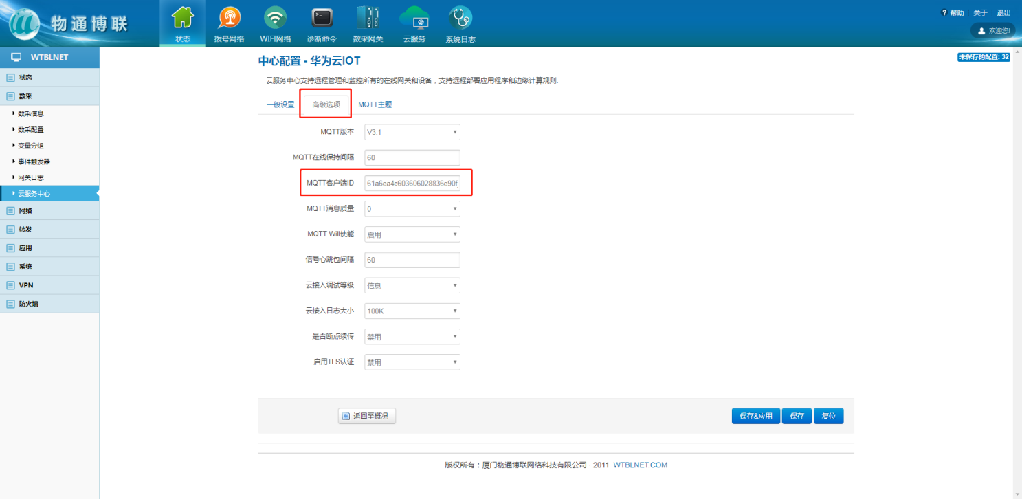 在網(wǎng)關(guān)本地web界面內(nèi),左側(cè)目錄欄中選擇數(shù)采,下拉框中的云服務(wù)中心來(lái)配置網(wǎng)關(guān)與華為云IOT的MQTT連接參數(shù),中心類型選擇華為云IOT平臺(tái),并勾選啟用,點(diǎn)擊添加。