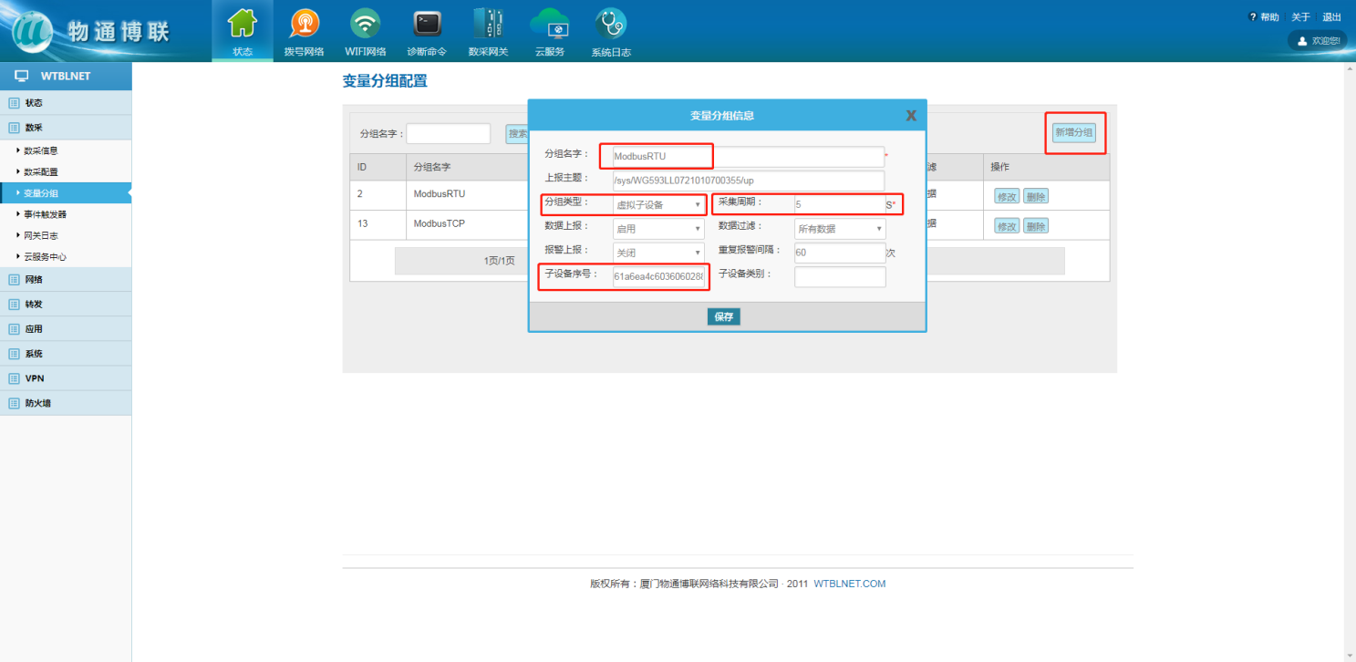 新增變量分組,分組類型選擇虛擬子設(shè)備,網(wǎng)關(guān)端分組綁定變量后,采集周期優(yōu)先級(jí)為分組設(shè)定的采集周期,網(wǎng)關(guān)“分組名字”對(duì)應(yīng)華為云IOT“服務(wù)ID”,網(wǎng)關(guān)“子設(shè)備序號(hào)”對(duì)應(yīng)華為云IOT子設(shè)備的“設(shè)備ID”。