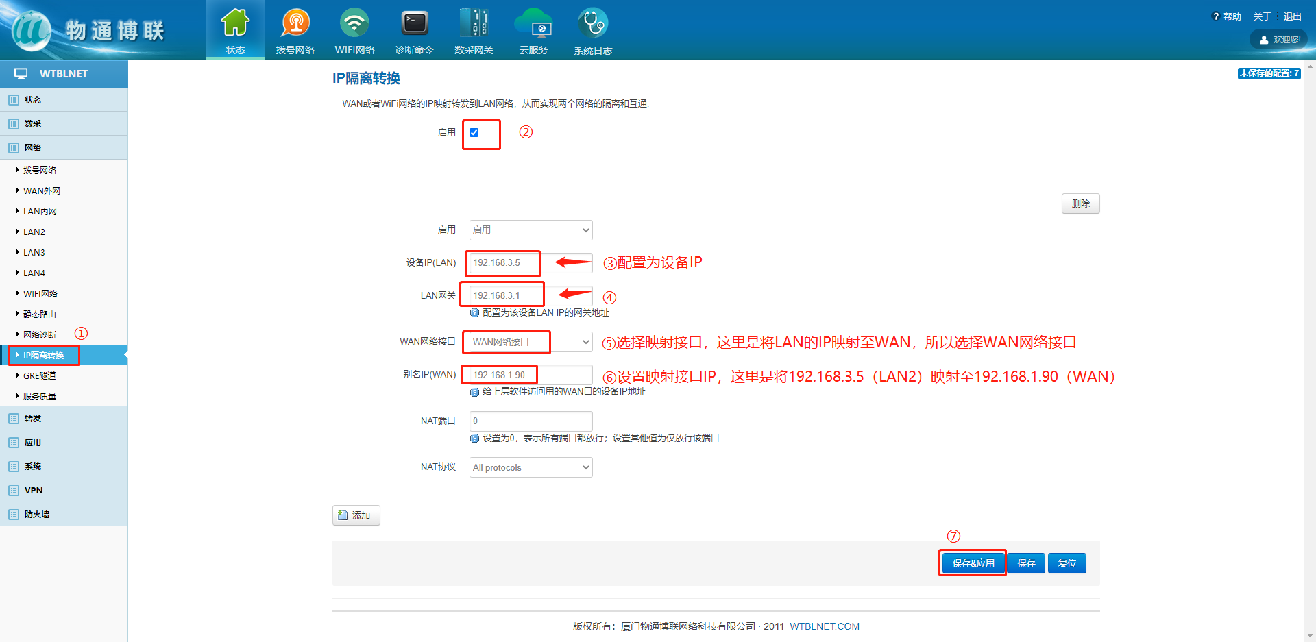 此處舉例PLC(IP:192.168.3.5)連接網(wǎng)關(guān)LAN口(IP:192.168.3.1),并將PLC的IP映射至網(wǎng)絡(luò)隔離器WAN口(IP:192.168.1.90),上位機(jī)(IP:192.168.1.8)即可通過隔離器WAN口訪問至位于隔離器LAN口的PLC。