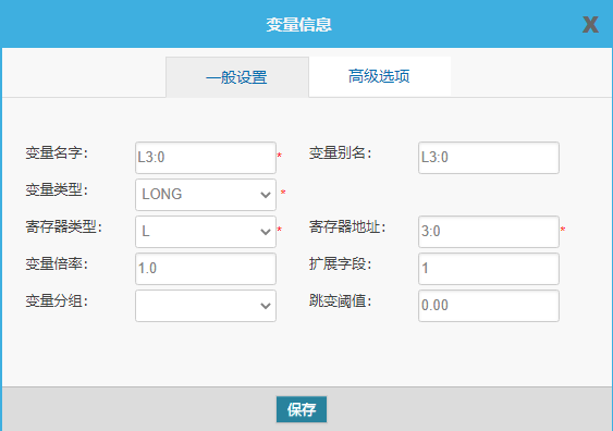 PLC采用網(wǎng)口通信時(shí),變量配置主要填寫變量名(網(wǎng)口協(xié)議較為特殊,需配置成與PLC內(nèi)的變量名一致)、變量別名(自定義,建議使用中文),寄存器類型和寄存器地址無需配置(默認(rèn)即可),可定義一些數(shù)據(jù)規(guī)則(如:倍率、小數(shù)點(diǎn)、單位、報(bào)警規(guī)則等)。