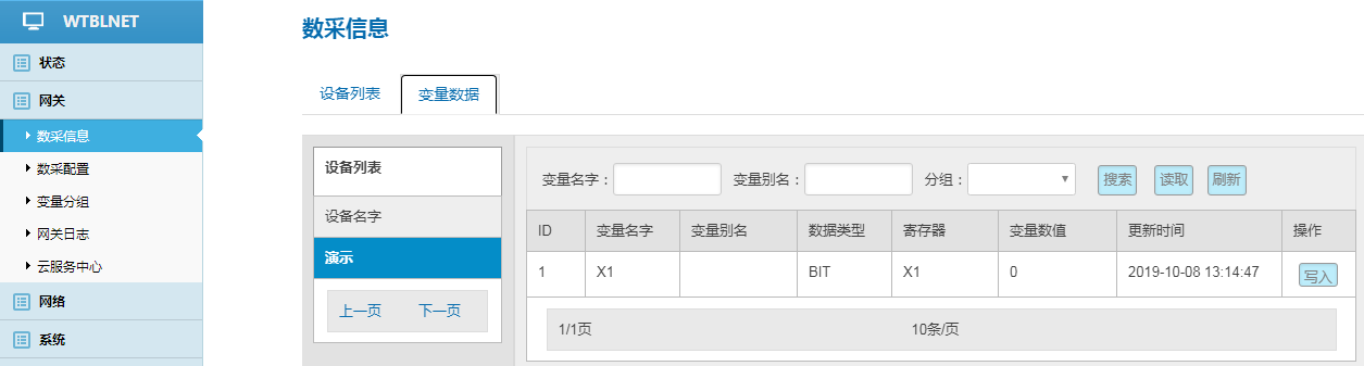 數(shù)采配置(設備信息+變量參數(shù))完成后,重啟采集程序并生效配置,即可在:數(shù)采信息---變量數(shù)據(jù)---設備名稱 中看到采集上來的數(shù)據(jù)。