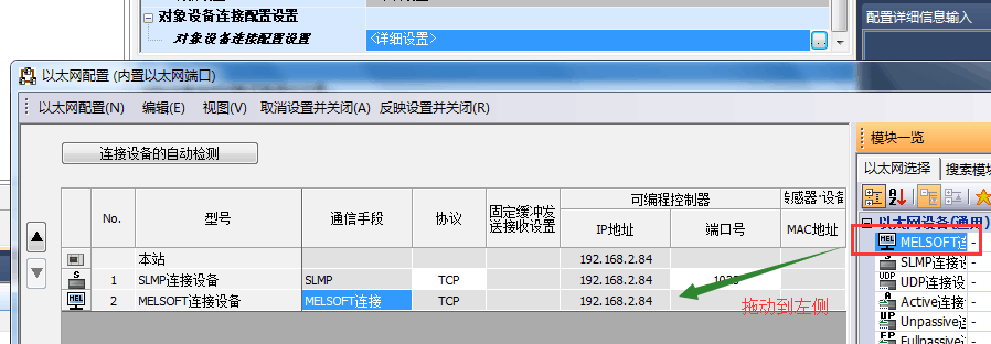 2、對象設備連接配置設置中新增“MELSOFT連接設備”通訊方式。