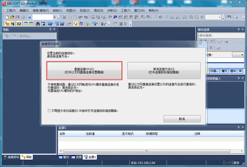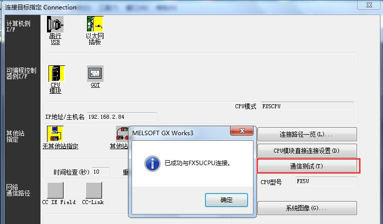 2、“CPU模式”設置,“經(jīng)由集線器連接”,填寫控制器的IP地址。