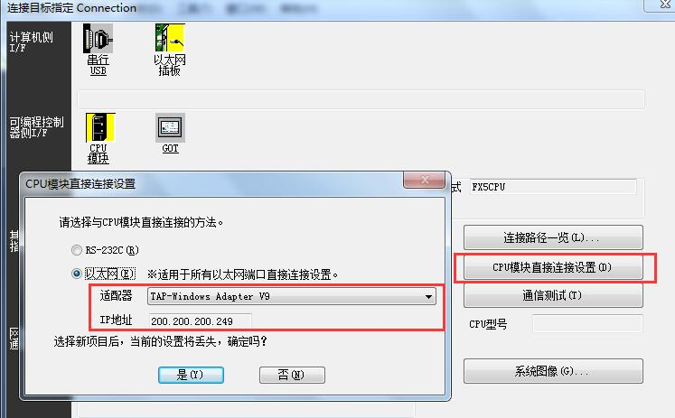 3、CPU模塊直連連接設置以太網(wǎng)適配適配器“TAP-WindowsAdapterV9”。