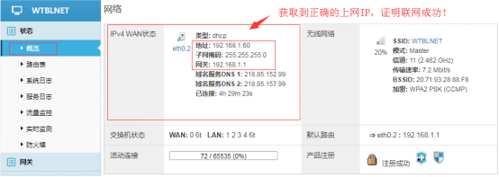 P.s.驗證網(wǎng)關(guān)已聯(lián)網(wǎng)情況:狀態(tài)-概率-網(wǎng)絡(luò)-IPV4WAN狀態(tài)---獲取到IP地址