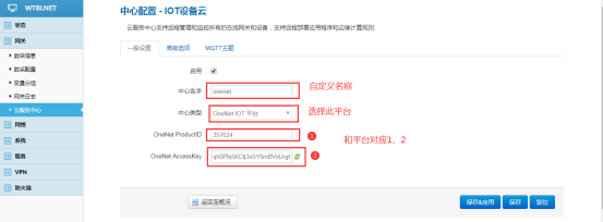 中心類型選擇OneNET IOT平臺,”OneNET ProductID”和”OneNET AccessKey”要分別與平臺上的“產(chǎn)品ID”、“access_key”一致。