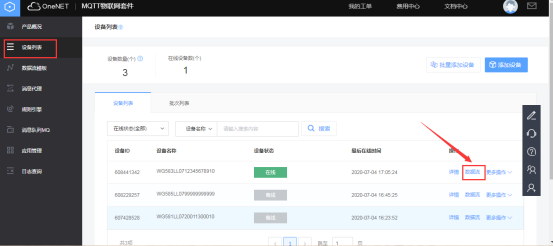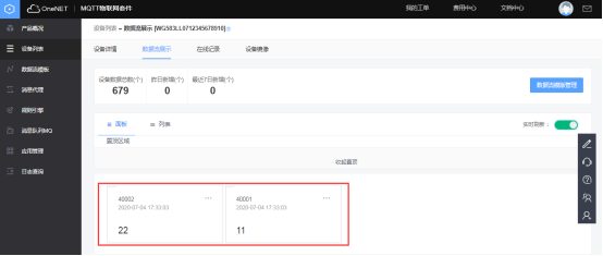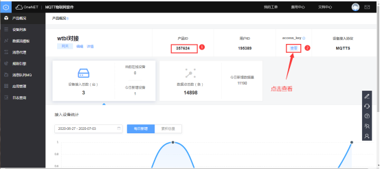 可進入OneNET平臺的對應產(chǎn)品中獲取網(wǎng)關云服務中心所需要填寫的ID和KEY。