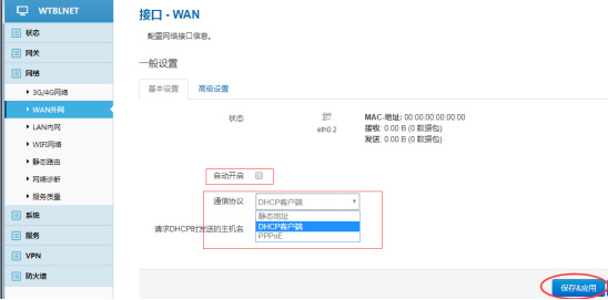 勾選自動(dòng)開啟,選擇通信協(xié)議(靜態(tài)地址、DHCP客戶端、PPPOE,三選一),保存&應(yīng)用。