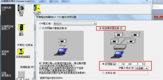 2、“CPU模式”設(shè)置,“經(jīng)由集線器連接”,填寫控制器的IP地址。
