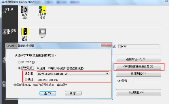 3、CPU模塊直連連接設(shè)置以太網(wǎng)適配適配器“TAP-WindowsAdapterV9”。