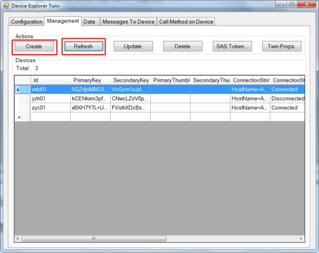 切換到”Management”選項(xiàng)卡,點(diǎn)擊”create”或”refresh/list”按鈕,如果正常,就能夠把在平臺(tái)配置的設(shè)備信息同步下來(lái)。