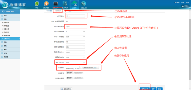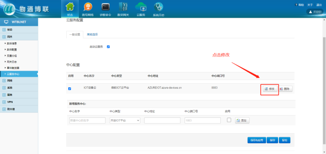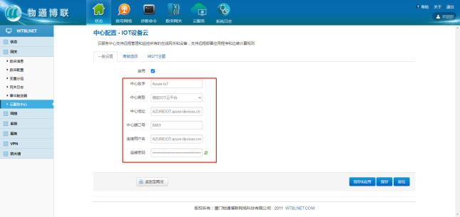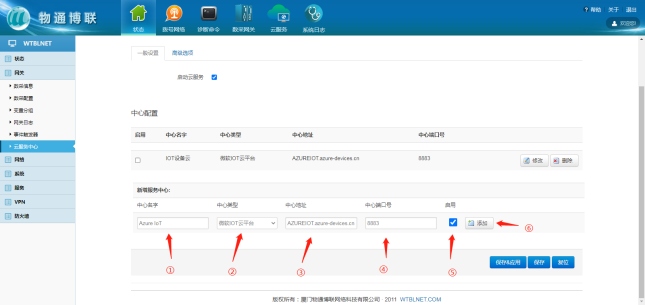 選擇“微軟云平臺(tái)”,打開(kāi)物通博聯(lián)網(wǎng)關(guān)WEB界面,新建一個(gè)連接中心,中心類型選擇微軟IoT云平臺(tái),輸入相應(yīng)信息,勾選啟用,點(diǎn)擊“添加”