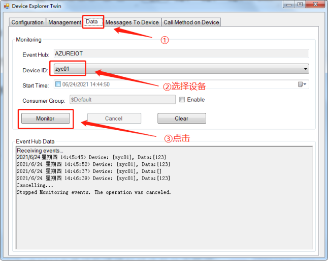 打開(kāi)配置工具軟件,切換到”data”選項(xiàng)卡,再點(diǎn)擊”monitor”按鈕進(jìn)行消息接收;