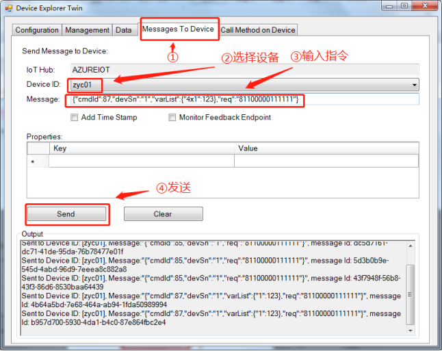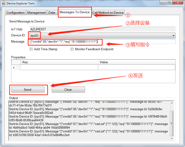 打開(kāi)配置工具軟件,切換到”Message To Device”選項(xiàng)卡,在”Message”輸入框,填寫要下發(fā)的消息