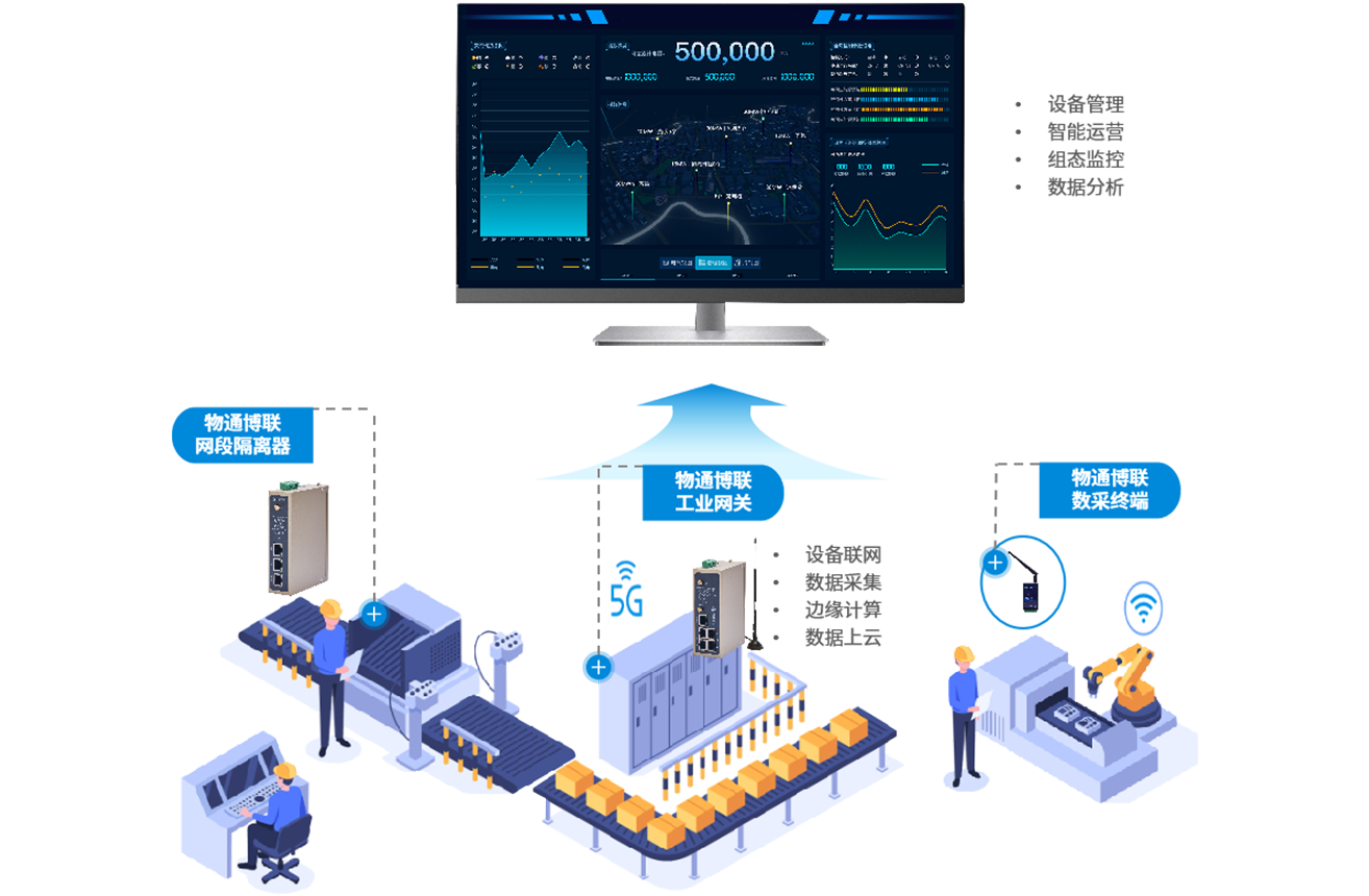 借助物通博聯(lián)的工業(yè)智能網(wǎng)關,實時采集工廠各類設備的運行數(shù)據(jù),如運行狀態(tài)、溫度、壓力、轉(zhuǎn)速等,將采集到的數(shù)據(jù)傳輸至設備管理平臺,進行設備資產(chǎn)檔案管理、運行管理、工單管理、采購管理、備件管理、維修管理、數(shù)據(jù)分析等,實現(xiàn)設備全生命周期管理。