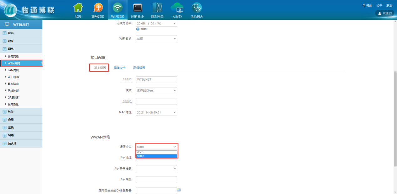 下載中心 視頻中心 常見問題 售后服務(wù) 工業(yè)網(wǎng)關(guān) 設(shè)備快線 數(shù)據(jù)云平臺 聯(lián)網(wǎng)設(shè)備 問答百科 工業(yè)智能網(wǎng)關(guān)如何設(shè)置靜態(tài)固定IP? 時間:2022-10-26 09:15:30 點擊:4989 關(guān)鍵詞:工業(yè)智能網(wǎng)關(guān),靜態(tài)固定IP,網(wǎng)關(guān)配置 問題:工業(yè)智能網(wǎng)關(guān)如何設(shè)置靜態(tài)固定IP? 回答: (1)WAN外網(wǎng)設(shè)置靜態(tài)IP 網(wǎng)絡(luò)—WAN外網(wǎng)—切換通信協(xié)議——填寫固定IP參數(shù) (2)WiFi網(wǎng)絡(luò)設(shè)置靜態(tài)IP 網(wǎng)絡(luò)—WiFi網(wǎng)絡(luò)—修改—切換通信協(xié)議—填寫靜態(tài)IP 上一篇:工業(yè)智能網(wǎng)關(guān)如何使用網(wǎng)線上網(wǎng)? 下一篇: 工業(yè)智能網(wǎng)關(guān)如何進行軟硬件復(fù)位?