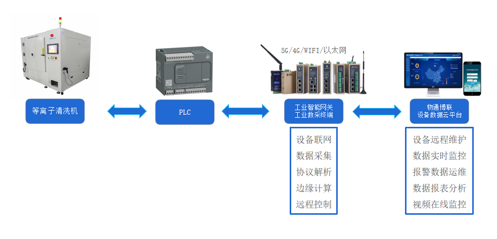 對(duì)此,物通博聯(lián)提供以工業(yè)智能網(wǎng)關(guān)為核心的等離子清洗機(jī)PLC數(shù)據(jù)采集遠(yuǎn)程監(jiān)控系統(tǒng)方案。通過(guò)將網(wǎng)關(guān)連接PLC,能夠?qū)崟r(shí)采集PLC內(nèi)部的各種數(shù)據(jù),包括模擬量、數(shù)字量、開關(guān)量等,如等離子功率、氣體流量、真空度等參數(shù)。隨后以5G/4G/WIFI/以太網(wǎng)等方式對(duì)接到云平臺(tái)或上位機(jī)中,從而工廠、設(shè)備制造商制定決策提供全面可靠的數(shù)據(jù)支持。