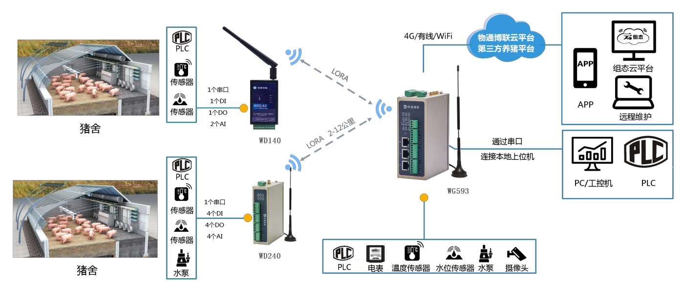 物通博聯(lián)以智能數(shù)采網(wǎng)關(guān)為核心,構(gòu)建智慧畜禽養(yǎng)殖環(huán)境監(jiān)測與控制物聯(lián)網(wǎng)系統(tǒng),深度整合養(yǎng)殖場內(nèi)的各類環(huán)境傳感器(溫濕度傳感器、氨氣傳感器、光照傳感器、風速傳感器等)、執(zhí)行設(shè)備(通風扇、加熱器、降溫噴霧、自動喂料機等)及監(jiān)控攝像頭,實現(xiàn)對養(yǎng)殖環(huán)境的全方位感知、精準調(diào)控與遠程管理,推動畜禽養(yǎng)殖向智能化、高效化轉(zhuǎn)型。