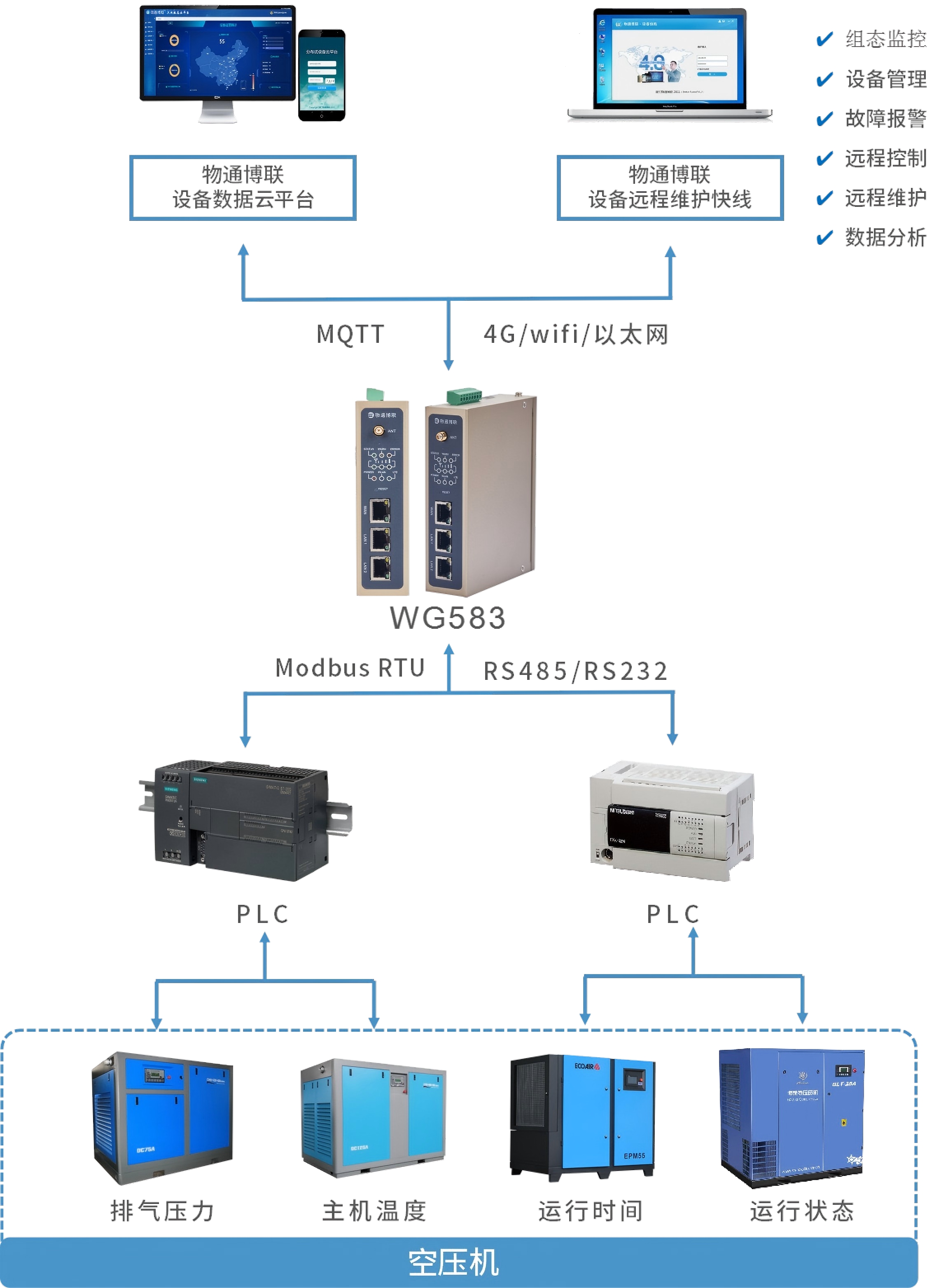 對(duì)此,物通博聯(lián)部署工業(yè)智能網(wǎng)關(guān)接入DCS系統(tǒng),能夠?qū)崟r(shí)采集空壓機(jī)運(yùn)行狀態(tài)與工藝參數(shù),并通過4G網(wǎng)絡(luò)對(duì)接到工業(yè)物聯(lián)網(wǎng)云平臺(tái)中,從而實(shí)時(shí)監(jiān)控兩臺(tái)空壓機(jī)的運(yùn)行狀態(tài)(手動(dòng)、自動(dòng)、維護(hù))與工藝參數(shù)(壓力、流量、溫度、運(yùn)行時(shí)間、電壓電流等),并在超出閾值時(shí)自動(dòng)告警,及時(shí)遠(yuǎn)程控制與管理,能夠避免出現(xiàn)意外重大事故,確保生產(chǎn)安全。