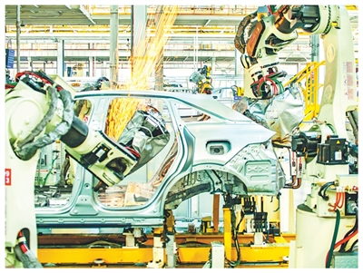 江蘇南京一家汽車自動化生產(chǎn)車間內(nèi),機械臂靈活焊接新能源汽車。朱紅生攝
