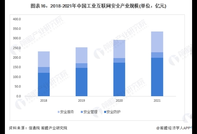 根據(jù)中國工信部數(shù)據(jù)測算,我國工業(yè)互聯(lián)網(wǎng)安全產(chǎn)業(yè)規(guī)模由2018年的233.8億元增長至2020年的292.9億元,2020年同比增長率為15.6%,前瞻初步統(tǒng)計2021年工業(yè)互聯(lián)網(wǎng)安全產(chǎn)業(yè)規(guī)模達到337億元左右。全球市場,根據(jù) Future Market Insights (FMI) 的一份最新報告預(yù)測,工業(yè)網(wǎng)絡(luò)安全市場預(yù)計將以7.7%的復(fù)合年增長率 (CAGR) 增長,從2022年的207億美元增長到2032年的435億美元。
