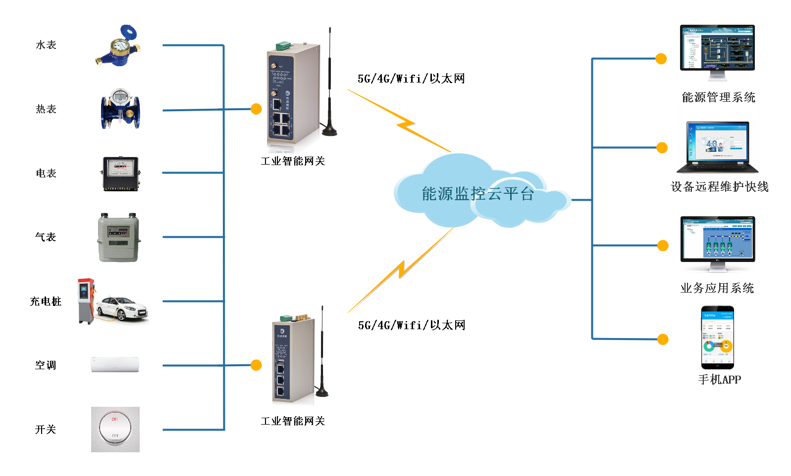 物通博聯(lián)能源互聯(lián)網(wǎng)解決方案是以節(jié)能降耗為核心目的,利用物聯(lián)網(wǎng)、大數(shù)據(jù)、邊緣計算等新技術(shù),通過物通博聯(lián)智能網(wǎng)關(guān)對企業(yè)內(nèi)的水、電、熱、氣等能源設備進行數(shù)據(jù)采集,將數(shù)據(jù)上傳到能源管理系統(tǒng),實時監(jiān)控、智能分析,實時掌握企業(yè)能耗情況,實現(xiàn)智能控制、能耗管理,達到節(jié)能降耗的目標。并且通過故障告警功能、預警機制及時發(fā)現(xiàn)設備的異常情況,同時可以通過設備快線實現(xiàn)設備遠程配置、診斷和上下載程序,及時進行檢查維護,防止設備故障及意外事故發(fā)生。