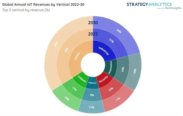 報(bào)告指出,到 2030 年,工業(yè)(24%)和汽車(16%)將繼續(xù)保持領(lǐng)先地位,其次是安防(12%),醫(yī)療保健(11%)和公用事業(yè)(10%)。