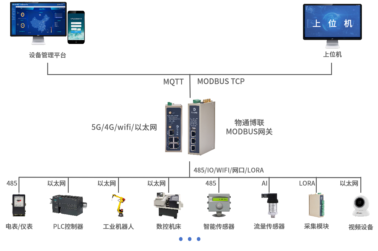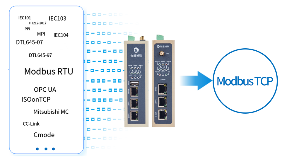 物通博聯(lián)Modbus網(wǎng)關(guān)是一款支持采集各種Modbus RTU和Modbus TCP協(xié)議設(shè)備的數(shù)據(jù),經(jīng)過網(wǎng)關(guān)的邊緣計(jì)算和數(shù)據(jù)標(biāo)準(zhǔn)化后通過MQTT協(xié)議上傳到各種云平臺(tái)和軟件;同時(shí)支持將各種非Modbus協(xié)議的工業(yè)設(shè)備數(shù)據(jù)(如PLC、儀器儀表、傳感器等)轉(zhuǎn)化為Modbus 協(xié)議對(duì)接給上位機(jī)軟件或者平臺(tái)實(shí)現(xiàn)數(shù)據(jù)互通互聯(lián)。