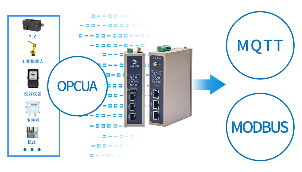 物通博聯(lián)OPC網(wǎng)關(guān)具有設(shè)備聯(lián)網(wǎng)、數(shù)據(jù)采集、協(xié)議解析、邊緣計算、云端接入等功能,支持OPC UA協(xié)議解析數(shù)據(jù)采集,能夠連接到PLC、儀器儀表、傳感器、數(shù)控機床、DCS、SCADA等,實時采集數(shù)據(jù)并通過Modbus/MQTT協(xié)議傳輸?shù)皆破脚_或本地上位機,支持采集設(shè)備數(shù)據(jù)通過OPC UA協(xié)議轉(zhuǎn)發(fā)給組態(tài)軟件、上位機軟件、云平臺,實現(xiàn)設(shè)備遠(yuǎn)程監(jiān)控、遠(yuǎn)程管理。