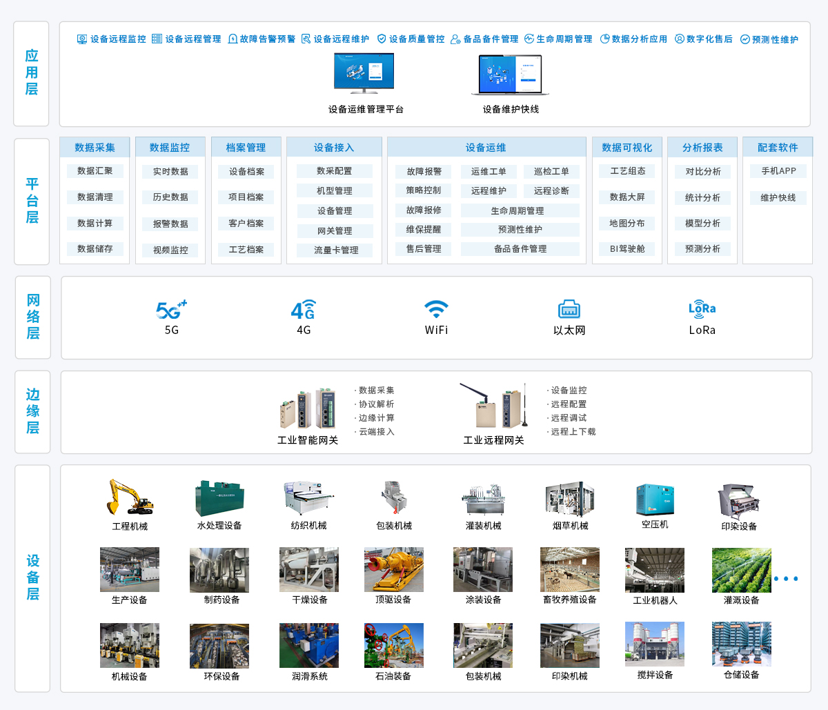 物通博聯(lián)針對設(shè)備制造商的裝備數(shù)字化需求,構(gòu)建了“終端數(shù)據(jù)采集-多網(wǎng)融合傳輸-云端智能運維-遠程協(xié)同服務(wù)”的全周期技術(shù)解決方案:以工業(yè)智能網(wǎng)關(guān)為核心,采集裝備運行參數(shù)、運行狀態(tài)等數(shù)據(jù),通過 5G/4G/WiFi/ 以太網(wǎng)等方式將標(biāo)準(zhǔn)化數(shù)據(jù)實時上傳至設(shè)備運維管理平臺。平臺借大數(shù)據(jù)分析與故障診斷算法,實現(xiàn)數(shù)據(jù)監(jiān)控、趨勢預(yù)測與異常識別,設(shè)備存故障風(fēng)險時自動觸發(fā)預(yù)警。依托設(shè)備維護快線,可遠程完成程序上下載、參數(shù)調(diào)試等操作,提升維護效率、降低運維成本,助力設(shè)備制造商實現(xiàn)裝備全生命周期數(shù)字化管理。