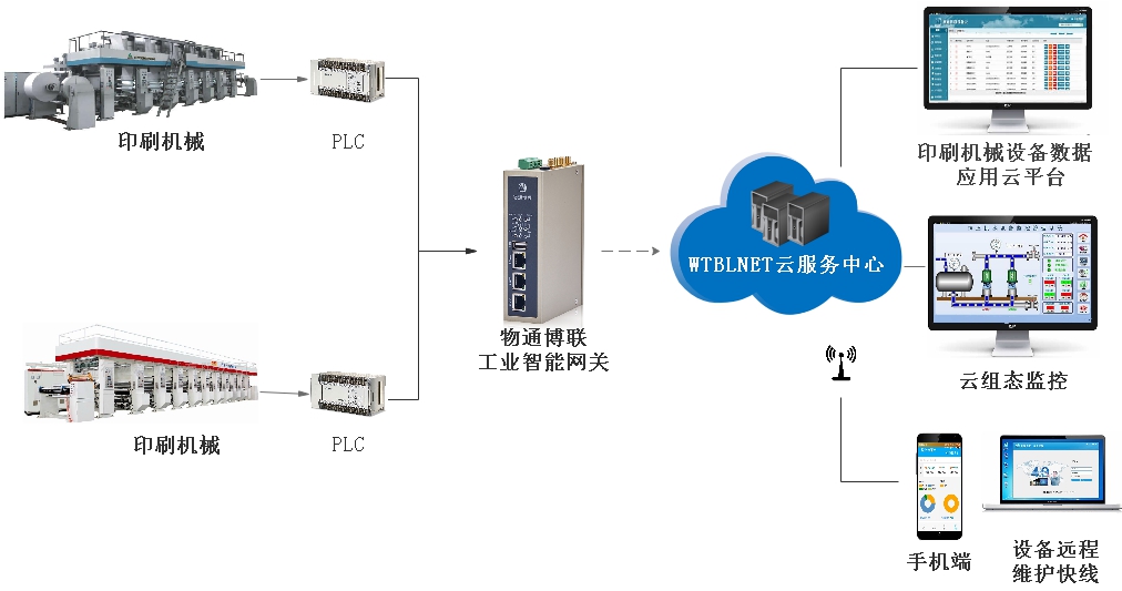物通博聯(lián)利用WG系列工業(yè)智能網(wǎng)關(guān)作為連接設(shè)備和監(jiān)控系統(tǒng)的橋梁,實現(xiàn)印刷機械設(shè)備數(shù)據(jù)的遠程監(jiān)控和維護,為印刷企業(yè)提供更加智能化的印刷機械設(shè)備遠程監(jiān)控智能運維解決方案。