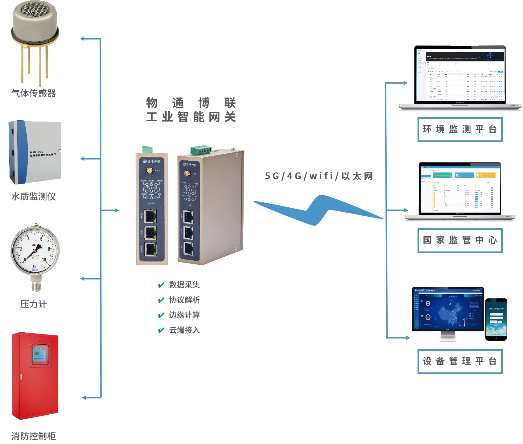 物通博聯(lián)的推出環(huán)境監(jiān)測安全預(yù)警系統(tǒng),將工廠內(nèi)的危險氣體傳感器、廢水監(jiān)測儀、管道壓力計及消防控制柜PLC接入到工業(yè)智能網(wǎng)關(guān)中,由工業(yè)智能網(wǎng)關(guān)采集各項環(huán)境參數(shù)和設(shè)備數(shù)據(jù)并上傳到上位機(jī)或云平臺進(jìn)行監(jiān)控和展示,進(jìn)而實現(xiàn)工廠現(xiàn)場和國家監(jiān)管中心的聯(lián)動監(jiān)管和實時控制,保證現(xiàn)場環(huán)境安全穩(wěn)定和可控。