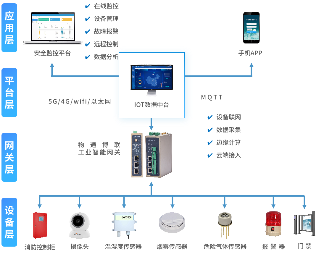 物通博聯(lián)推出的化工安全監(jiān)控預警系統(tǒng)集成了物聯(lián)網技術、大數(shù)據分析、云計算等技術,實現(xiàn)對化工生產、倉儲、運輸全過程的實時監(jiān)控和及時預警。通過將溫濕度傳感器、危險氣體傳感器、壓力計、PLC等設備接入到物通博聯(lián)工業(yè)智能網關中,實時采集設備參數(shù)并通過5G/4G網絡上傳到物通博聯(lián)IOT數(shù)據中臺,并將數(shù)據轉發(fā)給企業(yè)監(jiān)控平臺或國家監(jiān)管平臺。