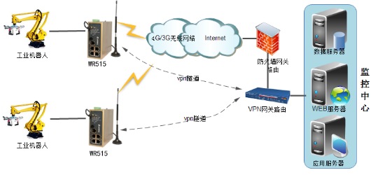 監(jiān)控中心端采用ADSL/光纖接入Internet 公網(wǎng),獲取固定公網(wǎng)ip。搭建vpn服務(wù)器。物通博聯(lián)工業(yè)無線路由WR515做vpn客戶端和服務(wù)器建立vpn隧道,實(shí)現(xiàn)兩端內(nèi)網(wǎng)互通。數(shù)據(jù)庫服務(wù)器上運(yùn)行采集系統(tǒng),可以采集工業(yè)無線路由WR515下接的以太網(wǎng)plc數(shù)據(jù)以及工業(yè)機(jī)器人數(shù)據(jù),從而達(dá)到采集監(jiān)控工業(yè)機(jī)器人運(yùn)行狀態(tài)目的。