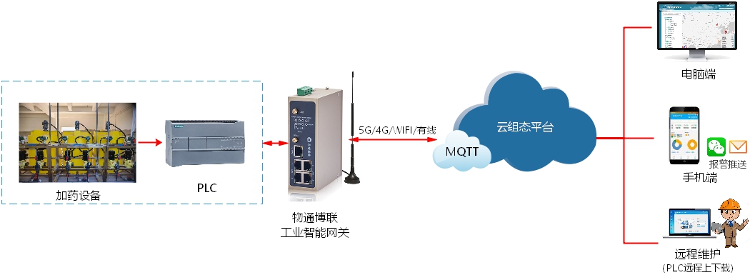 物通博聯(lián)提供污水處理加藥設(shè)備云組態(tài)遠程監(jiān)控系統(tǒng)方案。通過將物通博聯(lián)工業(yè)智能網(wǎng)關(guān)接入加藥設(shè)備控制器 PLC,實時采集數(shù)據(jù)并通過5G/4G/WIFI/以太網(wǎng)等網(wǎng)絡(luò)對接到物通博聯(lián)云組態(tài)平臺中,進行編輯繪制搭建組態(tài)大屏,從而直觀展示污水處理加藥設(shè)備的運行狀態(tài)與工藝參數(shù),并在出現(xiàn)異常時自動告警,從而靈活運用遠程控制、遠程維護、數(shù)據(jù)分析等手段,提高工作效率并減少人工成本,保障污水處理工作安全、高效開展。